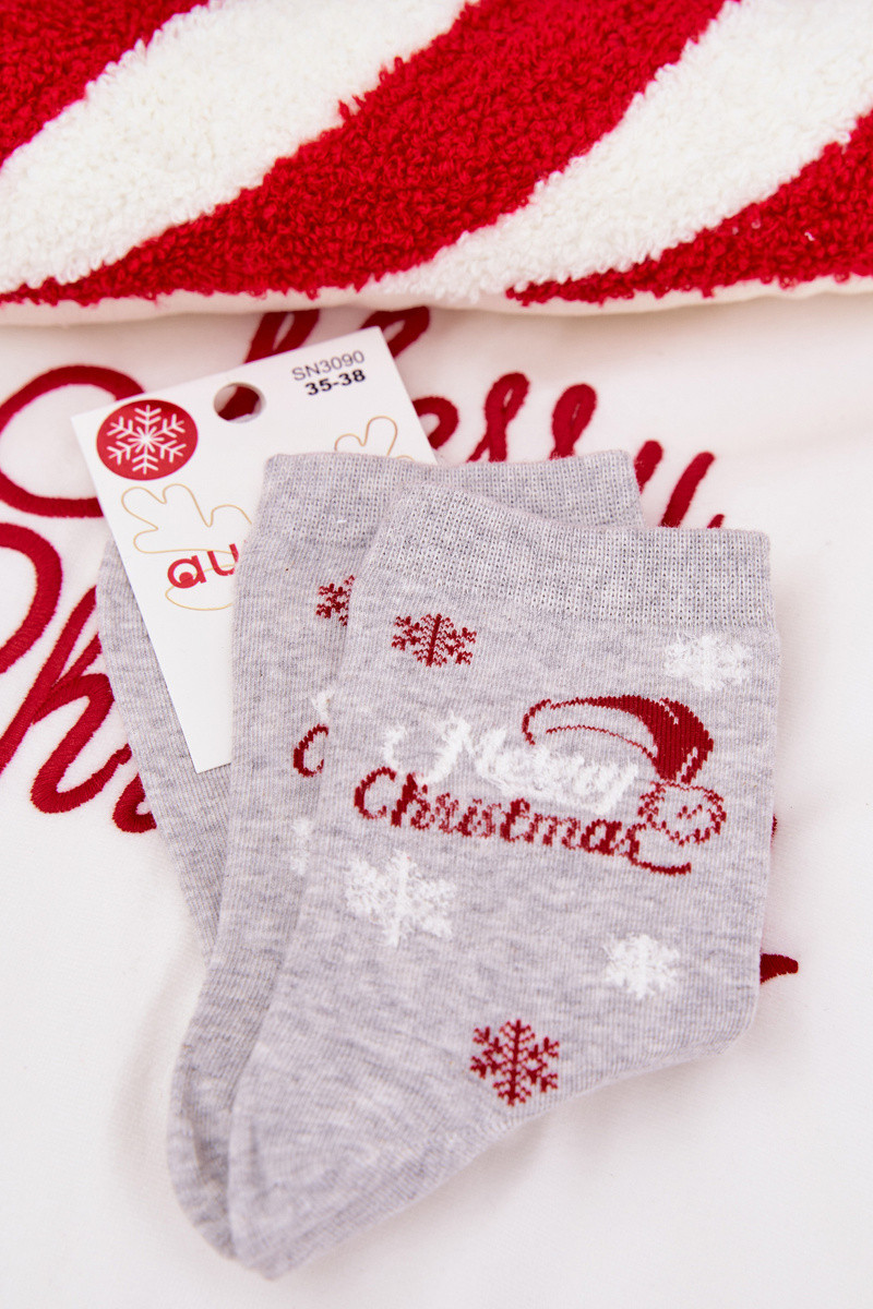 Calzini natalizi da donna grigi con fiocchi di neve e scritta