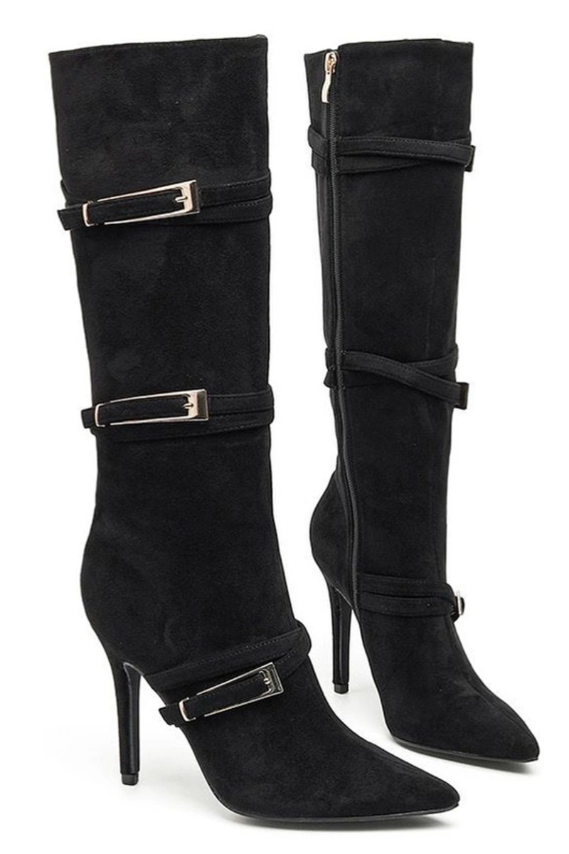 Stivali lunghi neri con tacco sottile e fibbie decorative Sadie
