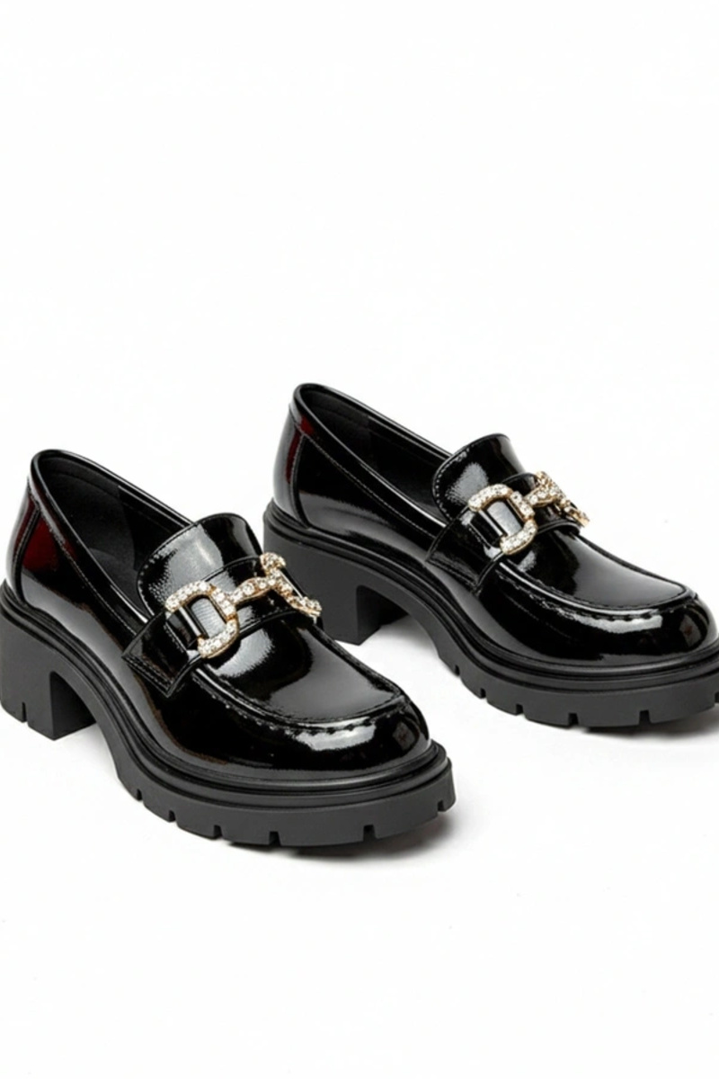 Mocassini laccati neri con tacco e zirconi Paola
