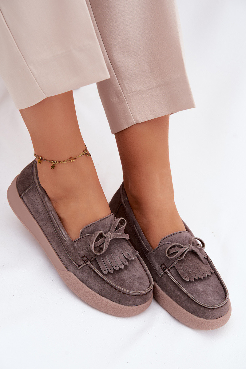 Mocassini in ecopelle scamosciata da donna con fiocchi e frange Vinceza 93223 in marrone