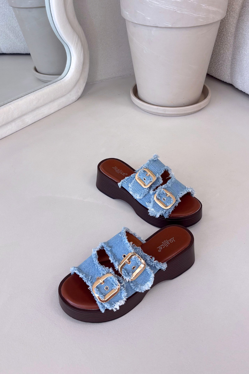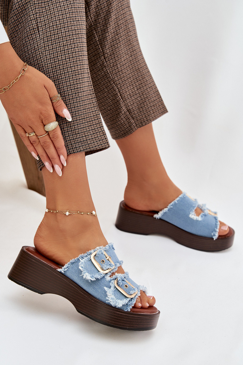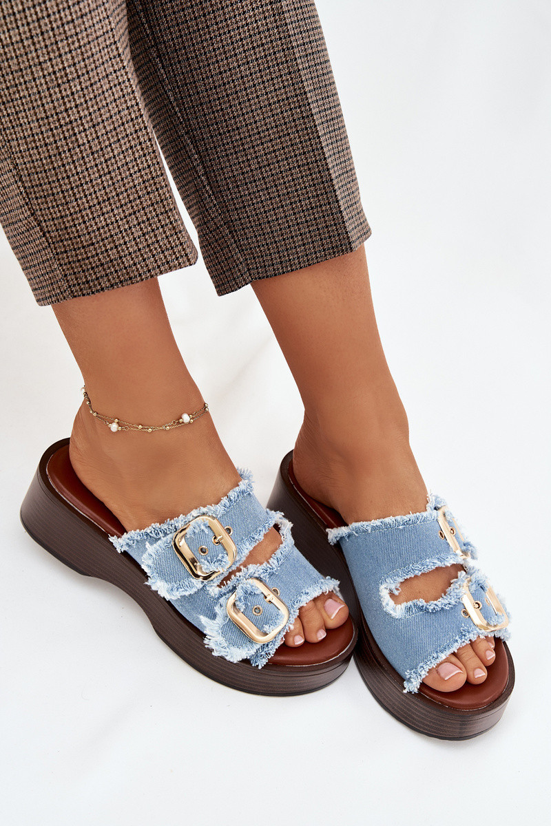 Infradito da donna con piattaforma color oro con fibbie color blu