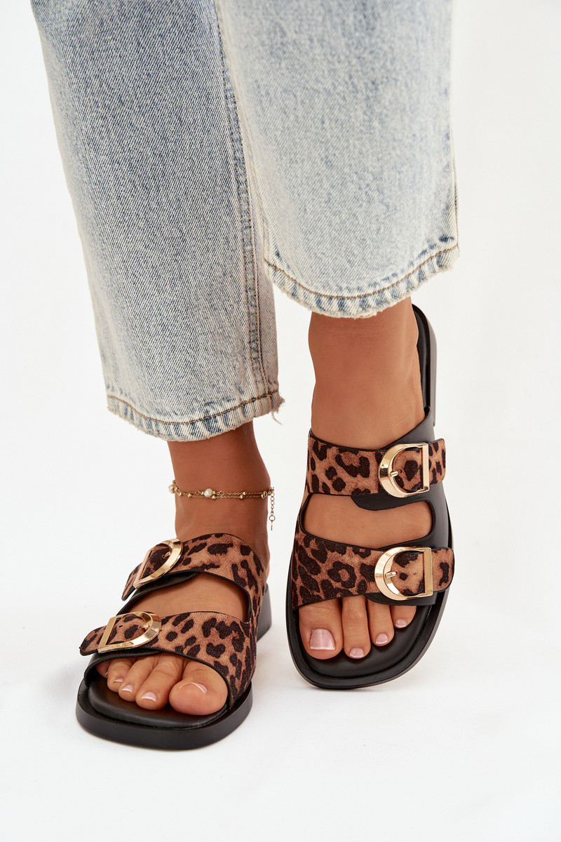 Infradito da donna color oro con fibbie in stampa leopardata color nero e marrone