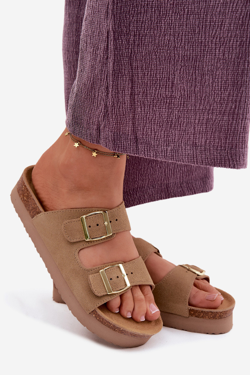 Ciabatte beige in suede sintetico da donna con piattaforma e fibbie Vinceza 102657