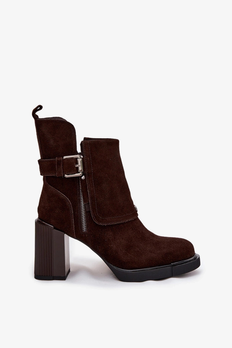 Stivaletti in camoscio naturale con tacchi e fibbie, Vinceza 91152, colore cioccolato