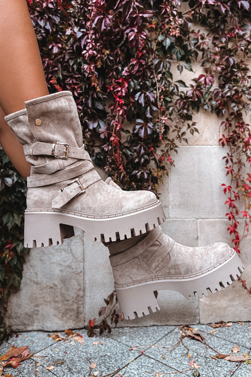 Stivaletti femminili con tacco largo, fibbie e nastri color sabbia Nerelisa