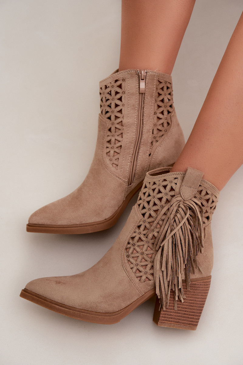 Stivaletti traforati in stile cowboy per donne con tacco e frange color sabbia Calissey