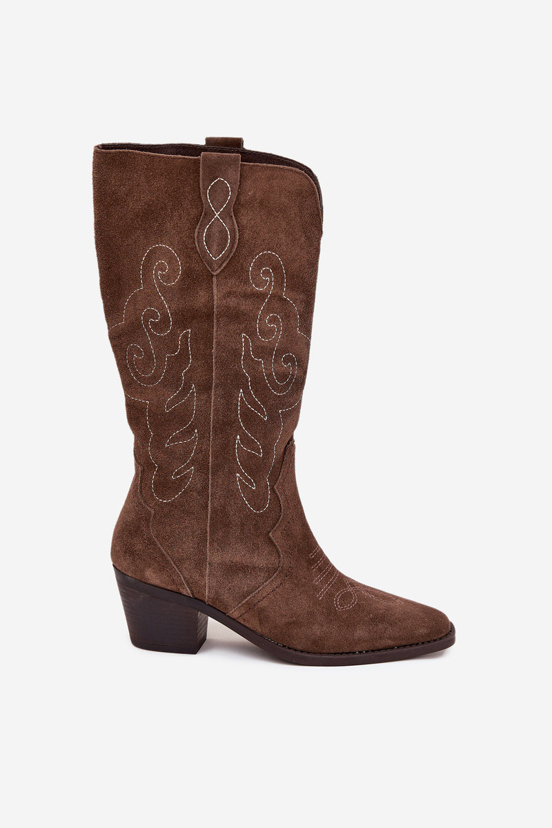 Stivali alti da donna in stile cowboy in camoscio con tacco, marroni, Karira