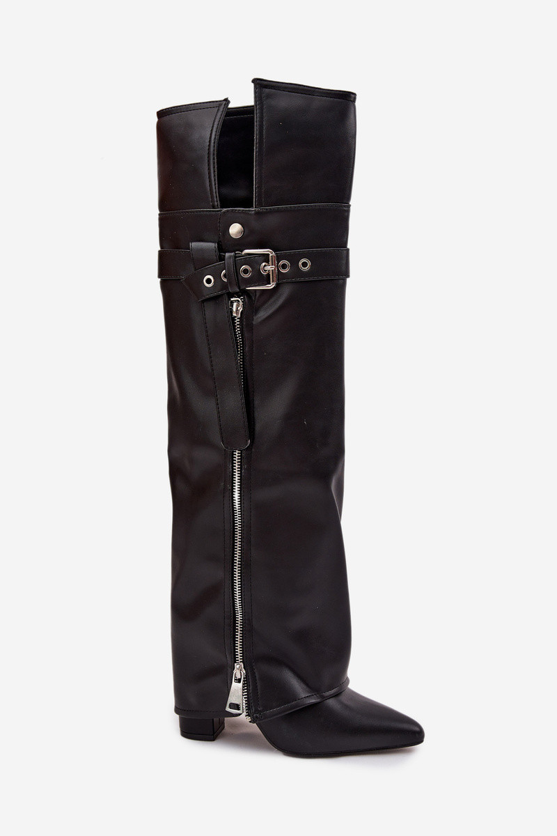 Stivali alti da donna foderati con tacco, cinghie, fibbie e zip argento, colore nero