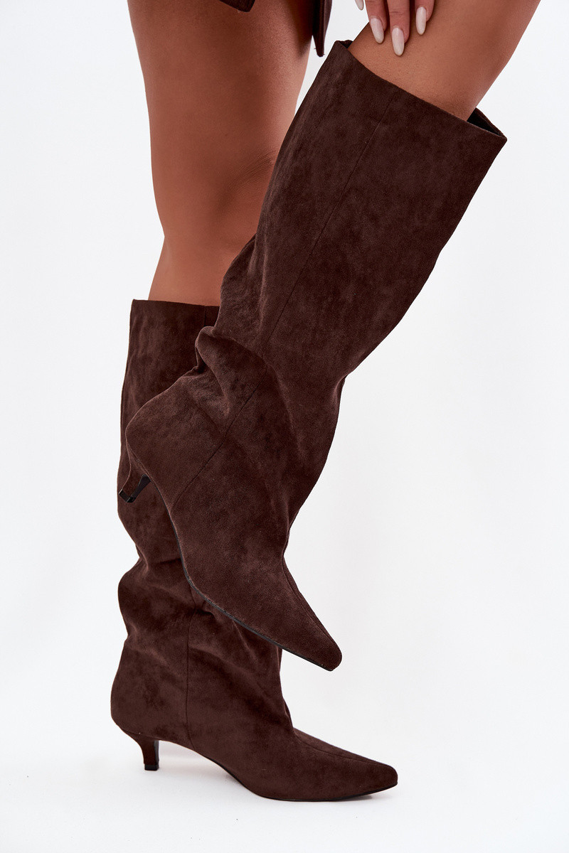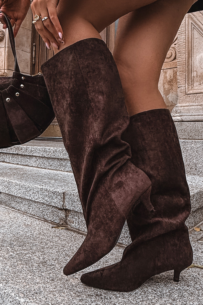 Stivali alti da donna in pelle scamosciata color cioccolato con tacchi Pheona