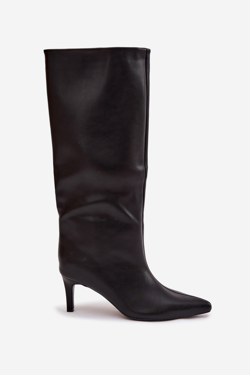 Stivali alti da donna, modello slip-on con tacchi sottili e cucitura, colore nero Olyvia