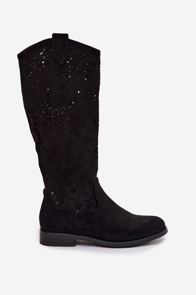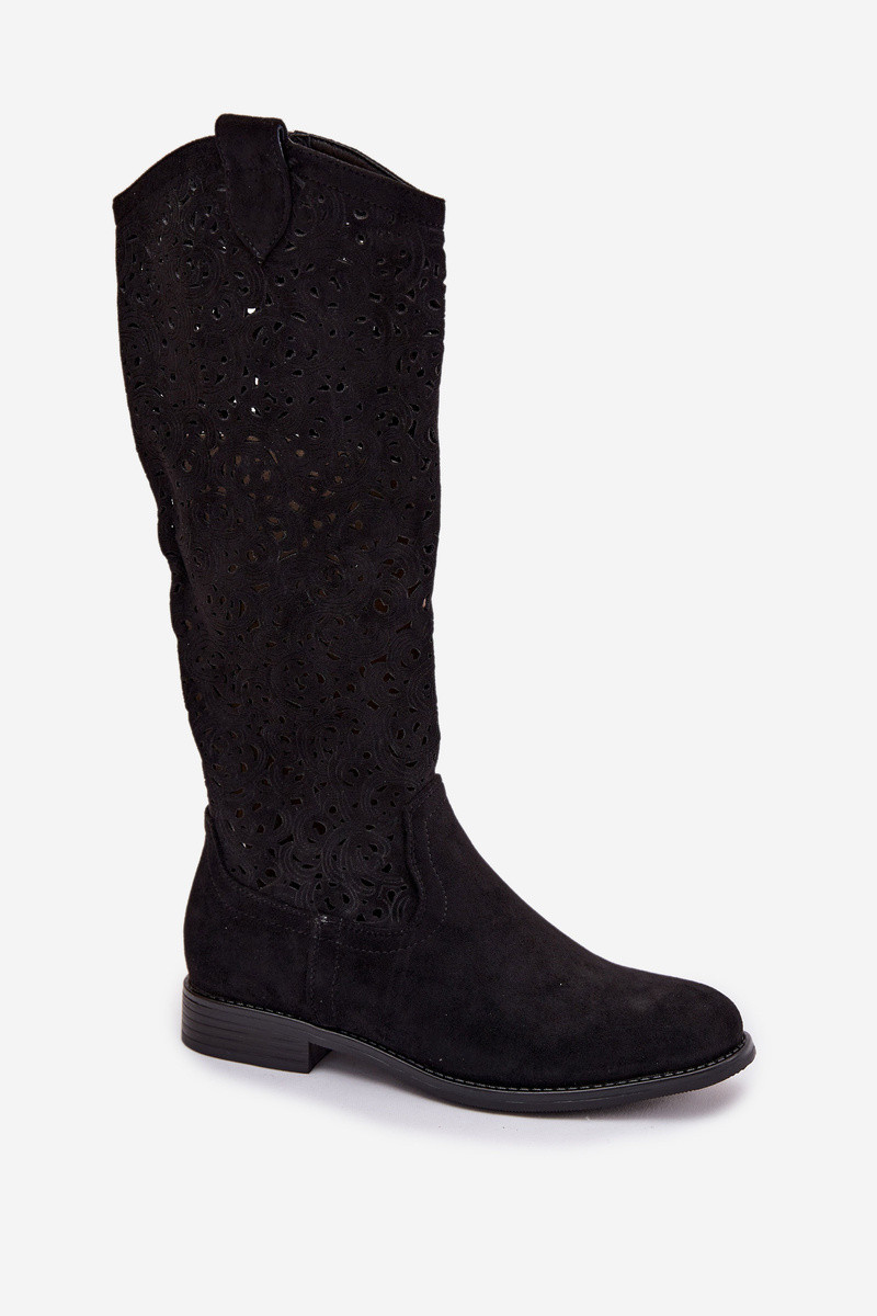 Stivali alti da donna con elementi traforati e tacchi larghi S.Barski HY61-8023, colore nero