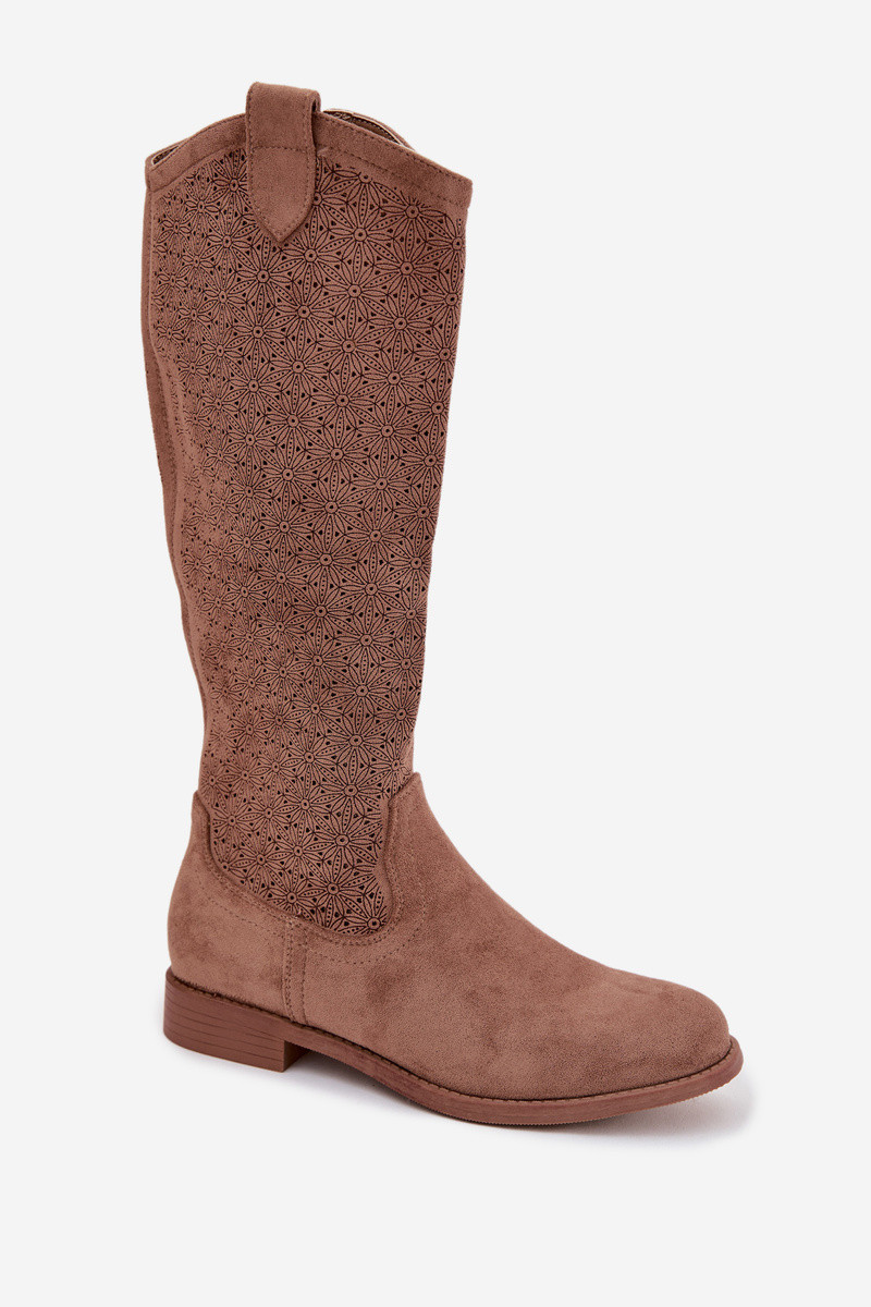 Stivali alti da donna con elementi a giorno e tacco largo S.Barski HY61-8022 color marrone